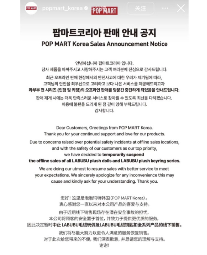 您好!这里是泡泡玛特韩国(POP MART Korea)。由于近期线下销售现场存在潜在安全事故的担忧,本公司将顾客的安全置于首位,并致力于提供更优质的服务,因此决定暂时中止 LABUBU毛绒玩偶及LABUBU毛绒钥匙扣全系列产品的线下销售。我们将尽最大努力以更令人满意的服务恢复销售。对于此次给您带来的不便,我们深表歉意,并恳请您的理解与支持。